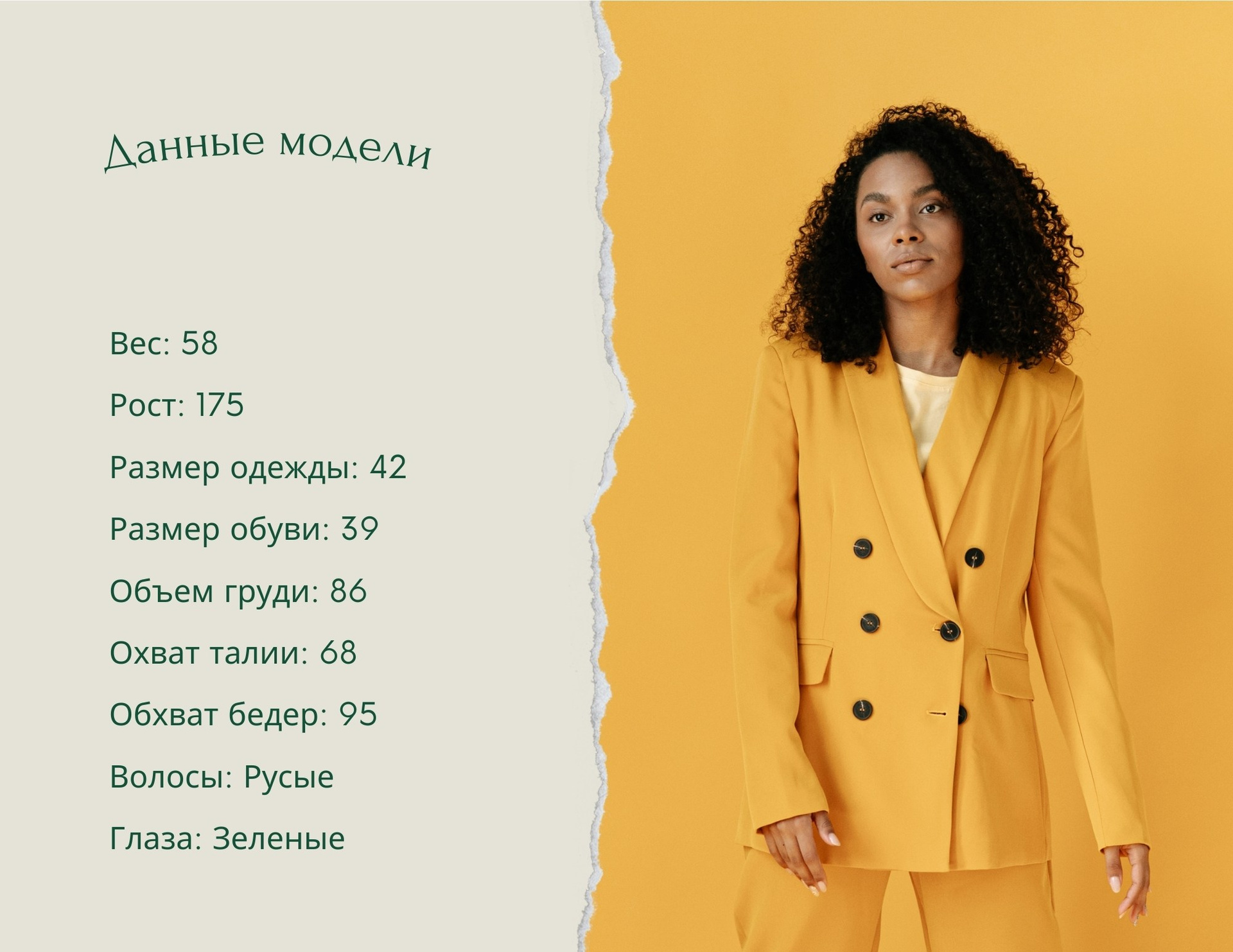 Портфолио модели горизонтальный — это удобный инструмент для работы с агентствами, брендами и фотографами. В макете уже предусмотрены развороты для основных параметров, портретных кадров, fashion-съёмок, крупного текста о модели и контактной информации. Всё, что нужно, — прислать нам фотографии и базовые данные.
